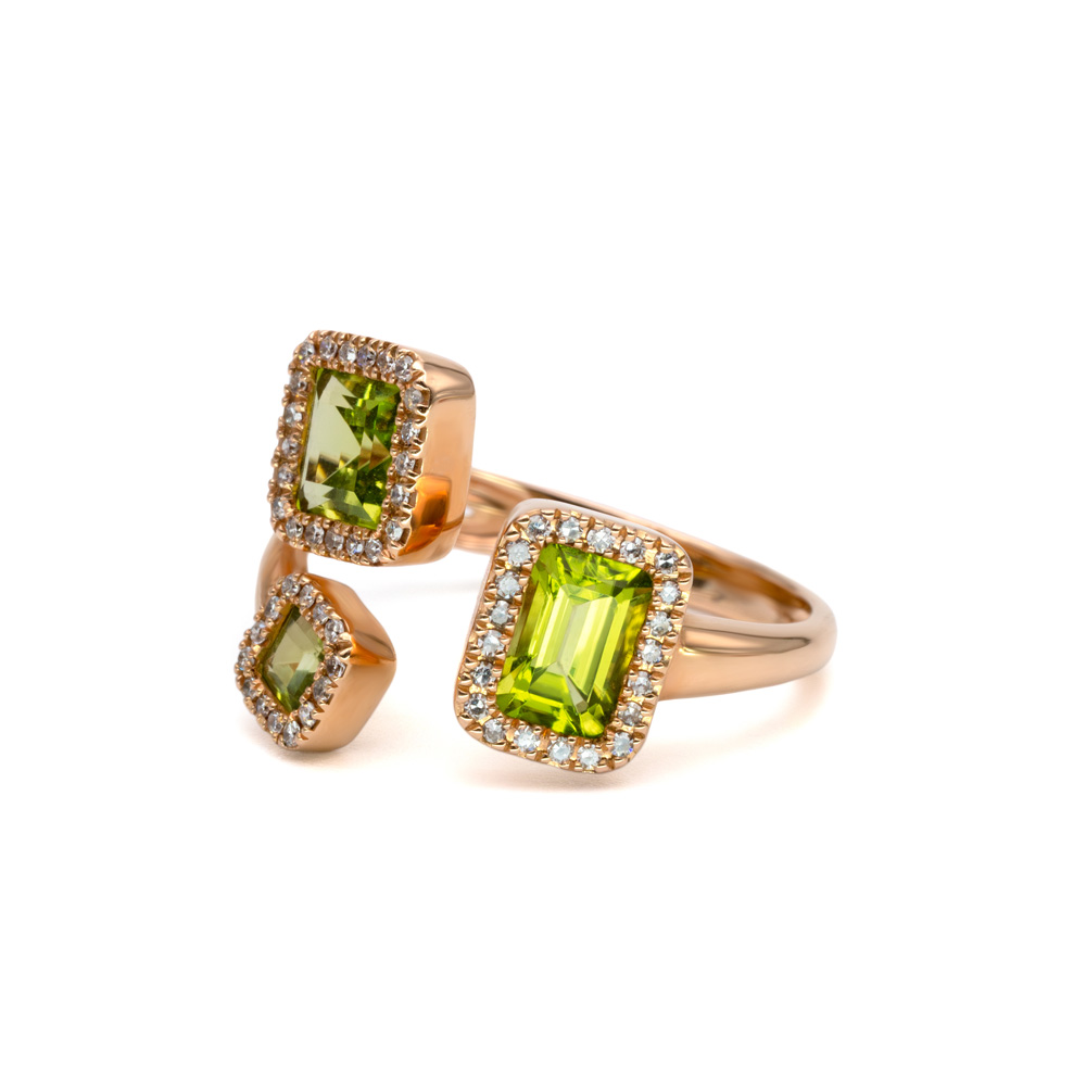 A Cassia gyűrű rozé aranyból készült, rendkívül egyedi, nyitott dizájnnal, ahol három különböző méretű téglalap alakú, élénkzöld peridot díszeleg, mindegyiket briliáns pavé foglalású gyémántkoszorú ölel körül. A 14 karátos arany síkban erőteljes 3,63 grammos, mégis könnyed konstrukciót alkot, a polírozott felület minden fényt ragyogóan visszaver. A geometrikus elrendezés játékosságot és modern eleganciát hoz, a pavé kövek apró csillogása minden kézmozdulatot ünnepivé varázsol.