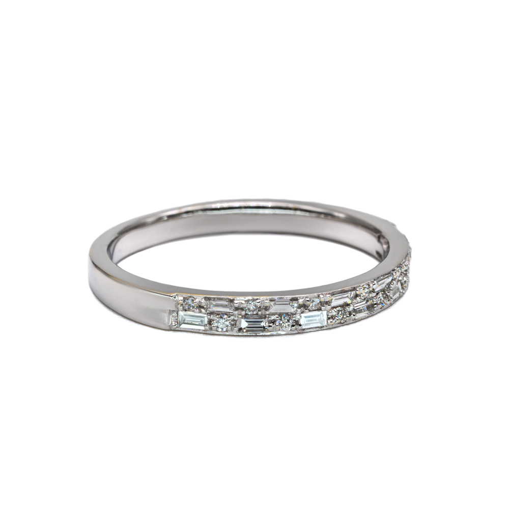 Az Azalea gyűrű különleges kombinációja a modern geometriának és a klasszikus ragyogásnak. A teljesen sima fehérarany gyűrűtest letisztult, tükörfényű felületű, amelyen apró baguette és briliáns csiszolású gyémántok sorakoznak egyetlen elegáns, kézzel foglalt csatornában. Horizontális elrendezésük vizuálisan nyújtja a gyűrűt, míg a kontrasztos kövek játékosságot és stílusos szikrázást visznek minden mozdulatba. A lekerekített, kényelmes comfort-fit profil diszkrét eleganciát biztosít a mindennapi és alkalmi viselethez; a precíz csatornafoglalás pedig tartós, biztonságos megoldás.