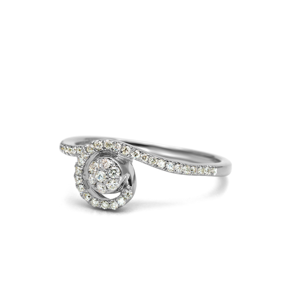A Calantha gyűrű formavilága dinamikus lendületet sugároz: hullámos, kecses 14 karátos fehérarany sínje egyetlen irányba hajlik, középpontjában pedig egy körmotívum foglal helyet, amit spirálszerűen ölelő pavé gyémántsor tesz igazán izgalmassá. A körben elhelyezett, apró briliánsok kiemelik a központi csiszolt követ, amelyet szintén ragyogó gyémántok vesznek körül. Az aszimmetrikus, modern forma és a részleteiben precíz foglalat a napfény játékát követi végig a felületen, a sima, fényes arany pedig extra ragyogást kölcsönöz minden kézmozdulathoz.