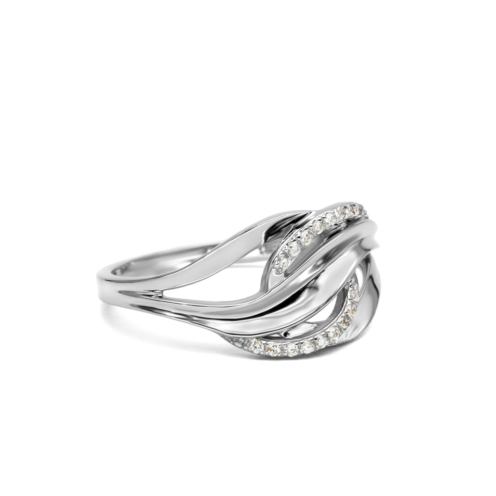 A Camassia gyűrű összetett, kétszintű hullámforma szerkezetével igazán modern benyomást kelt. A sín profilja két ívelt, fényesen polírozott fehérarany sávból és két, gyémánt pavé sorral hangsúlyozott ív motívumból áll, amelyek egymást átszövő, szinte organikus mintázatot alkotnak. A precízen beültetett apró gyémántok táncra kelnek minden mozdulatban, a vastagabb, stabil belső sín pedig kényelmes, biztonságos viseletet ad.