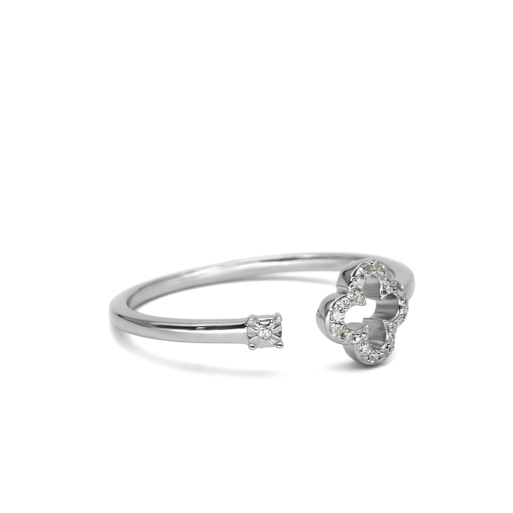 A Clemira gyűrű játékos, mégis kifinomult stílust képvisel – elegánsan nyitott sínje, egyik végén pavé gyémántos négylevelű motívummal, másik végén egyetlen ragyogó kővel zárul. A vékony, 14 karátos fehérarany karika légies könnyedséget kölcsönöz a kéznek, miközben az aszimmetrikus elrendezés különleges vizuális ritmust teremt. A formavilág egy stilizált, négy levelű virágot idéz, amely egyszerre modern és időtlen nőiességű.