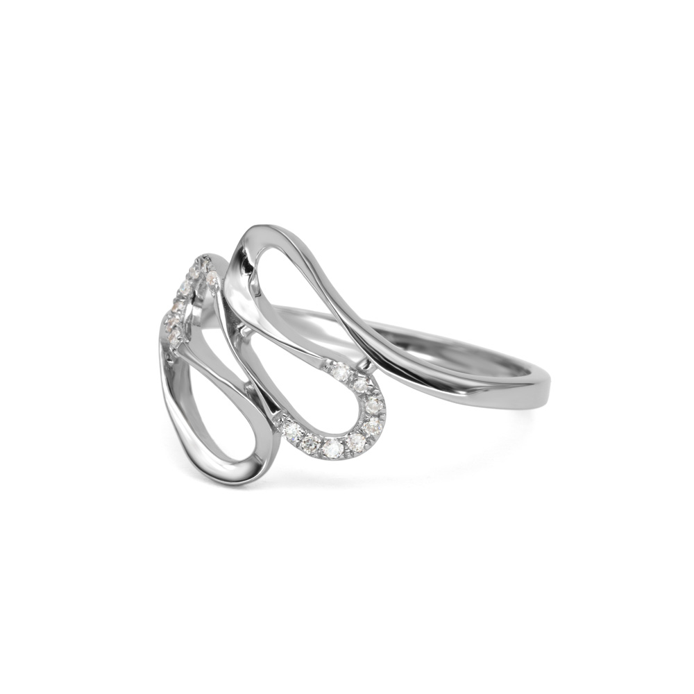 Az Ornithia gyűrű modern, absztrakt hullámformái különleges dinamikát teremtenek az ujj körül: 14 karátos fehérarany sínei plasztikusan ölelik egymást, miközben a két oldali áttört hullám, pavé foglalatú briliáns gyémántokkal kirakva, szárnyat vagy virágszirmot idéznek. A formák légiesek, letisztultak, a polírozott arany mindig új arcát mutatja a fényben.