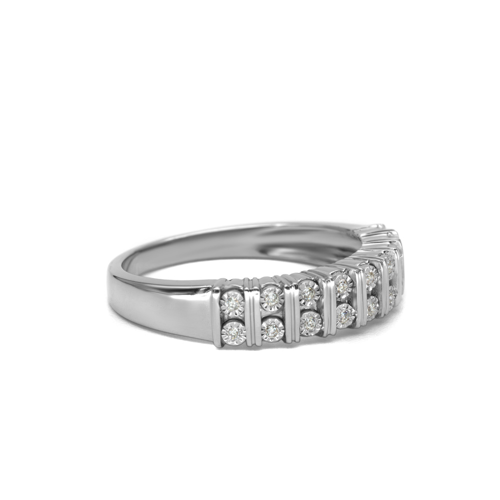 A Muscari gyűrű sávos, dynamikus szerkezete a modern elegancia és a precíz kézművesség mintapéldája. A 14 karátos fehérarany sín teljesen körbefutó, merőleges hatású sávos foglalatokban ragyogó briliáns gyémántokat sorakoztat fel, amelyek pontosan illeszkednek egymás mellett.