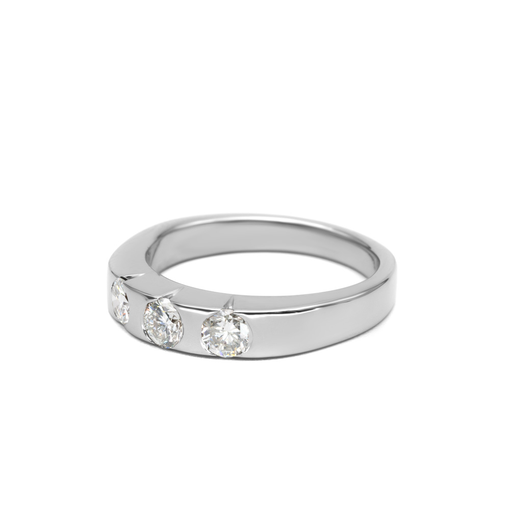 A Cassira gyűrű a modern letisztultságot és impulzív eleganciát ötvözi: 14 karátos fehérarany sínjében három briliáns csiszolású, mélyített foglalatú gyémánt ragyog tökéletes harmóniában. A széles, fényesen polírozott aranysáv lágy tükröződésével kiemeli a drágakövek tisztaságát, a három kő letisztult elosztása pedig a Cassira virág motívumú névhez méltó, exkluzív ritmusosságot sugároz.