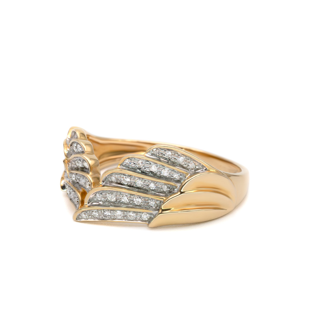 A Gloriosa gyűrű szoborszerűen ívelt, többrétegű karikájával és aranylóan fénylő felületével a modern luxus lenyűgöző megtestesítője: 14 karátos sárga arany sínjét lépcsőzetesen kirakott, ragyogó G-H színű, Si minőségű gyémántsorok díszítik, amelyek éteri hullámokban omlanak le a kézfejen.