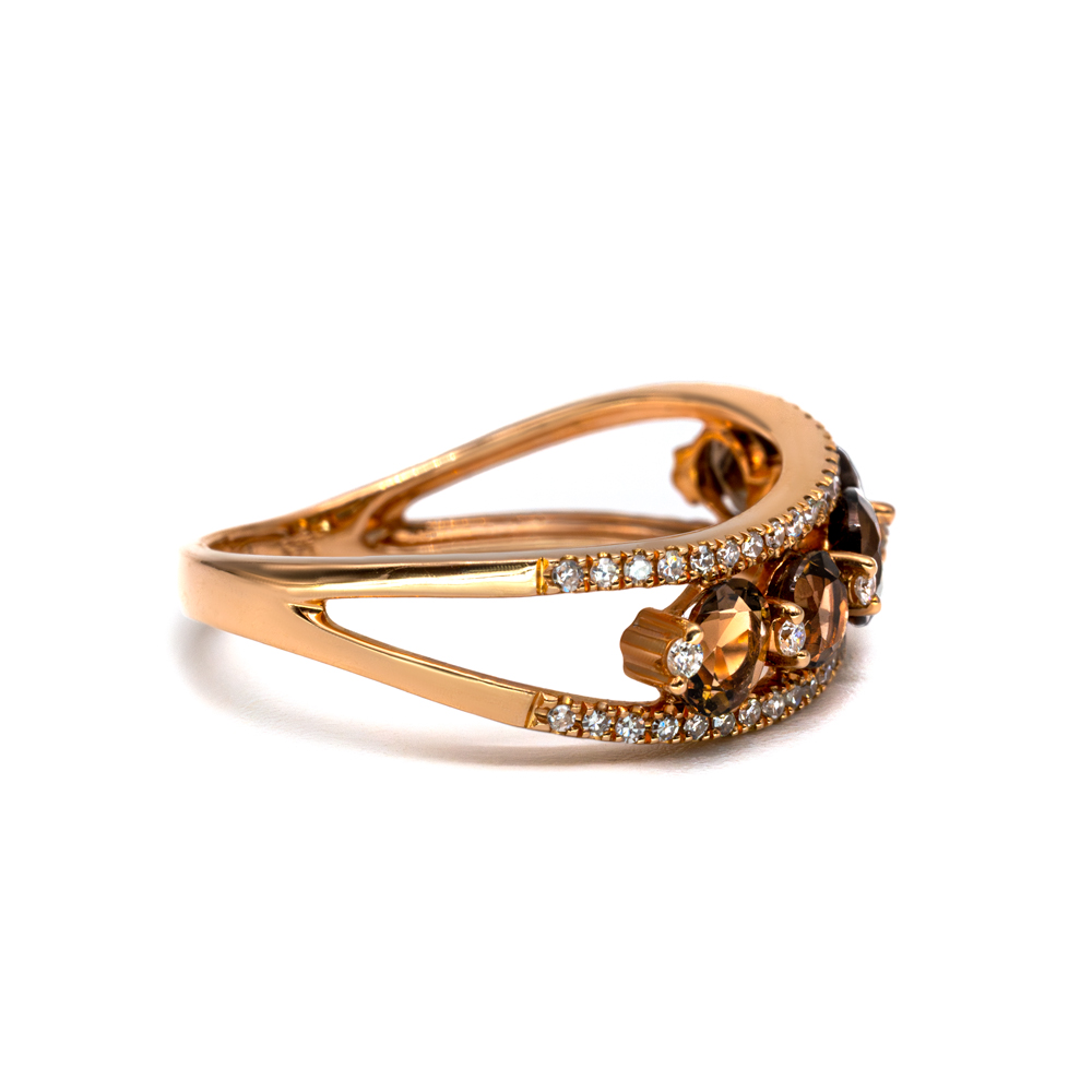 A Hazel gyűrű intenzív arculatát öt, ovális csiszolású füstkvarc uralja, amelyeket két oldalról precízen pavé foglalásban sorakozó briliáns gyémántok ölelnek körbe. A szár kettős, hullámvonalban ívelt rozé arany vonalai modern luxust és dinamizmust kölcsönöznek az ékszernek. Tükörfényes polírozású felülete, valamint a komfort-profil a kényelmes mindennapi viseletet biztosítja, miközben a sötétbarna kavicsok és a világos gyémántok párosa minden alkalomra különleges, karakteres választássá teszi. Páratlan árnyalatkontraszt, kiváló kézi kidolgozás és a Petrals stílusjegyek keverednek ebben a stílusos darabban.