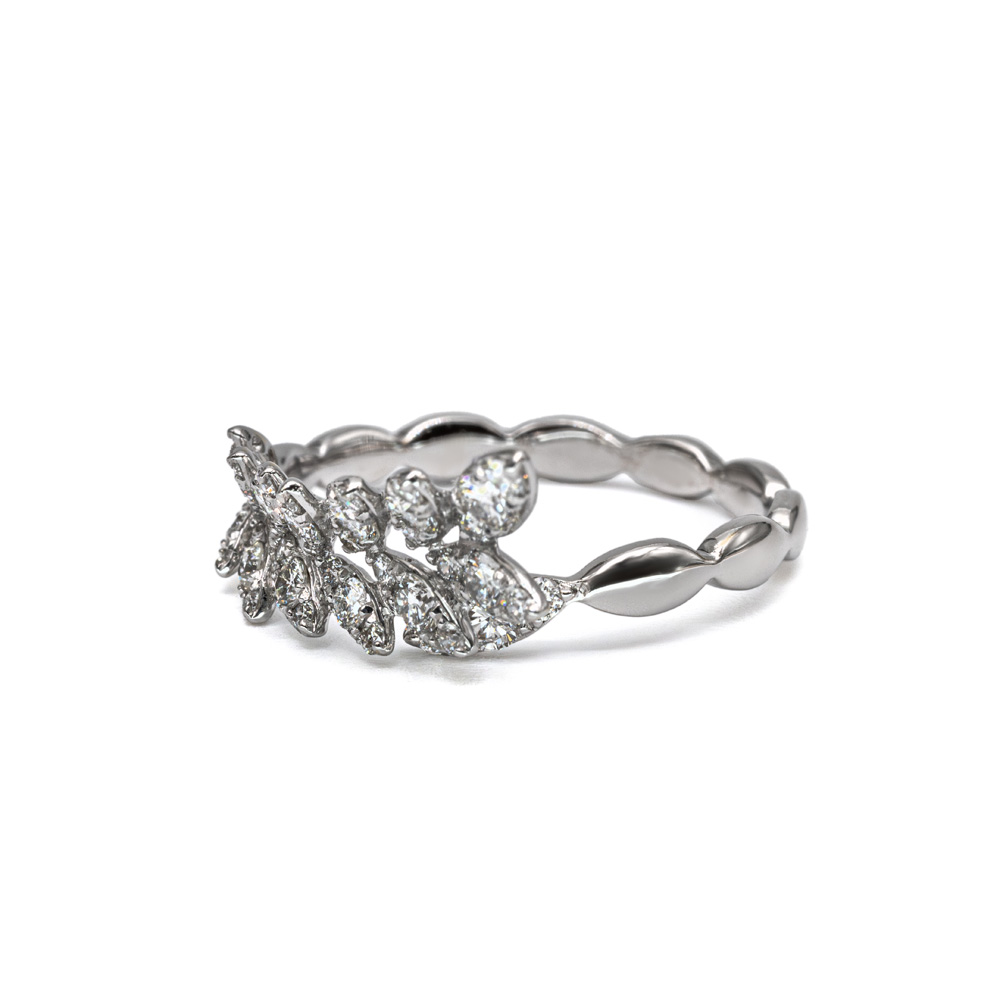 A Laurel gyűrű egyedülálló, természetet idéző motívumával és ragyogásával igazi különlegesség a Petrals kollekcióban. A 14 karátos fehérarany vékony szárára karakteres babérlevél formák kerültek, melyeket teljes egészében apró, briliáns csiszolású gyémántok borítanak. A levelek szabálytalan, hullámzó elrendezése természetes eleganciát és könnyedséget ad az ékszernek, miközben a tükörfényes arany kiemeli a gyémántok finom csillogását. Ez a gyűrű tökéletes társa lehet minden napnak, de különleges alkalmakkor is harmonikus, modern megjelenést biztosít, a klasszikus és botanikus stílus szerelmeseinek.
