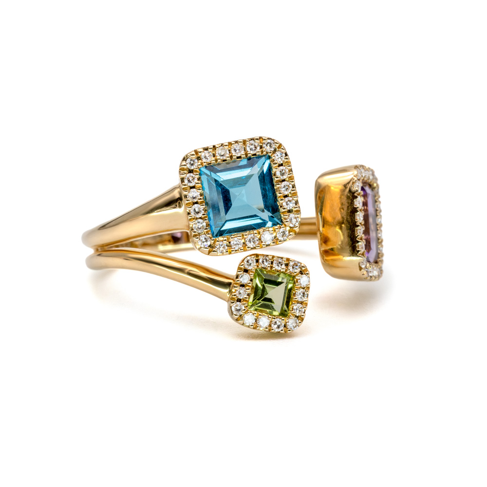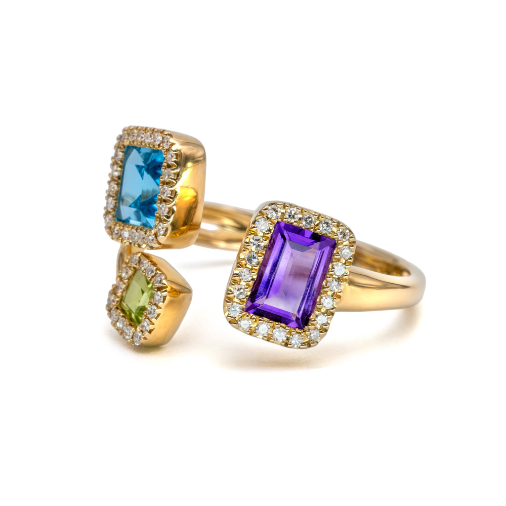 A Lobelia gyűrű egy elegáns, modern trió – minden kő más árnyalatú: világoskék topáz, zöld peridot és ibolya ametiszt alkot egyedi, aszimmetrikus kompozíciót, mindegyik finoman megemelt, négyzetes foglalatban ül. Az arany alapszín még inkább kiemeli a drágakövek ragyogását, az összes központi követ és színes motívumot briliáns pavé gyémántkeret öleli át.