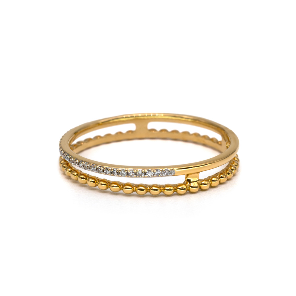 A Mimosa gyűrű egyedülálló stílusával hódít: két különböző textúrát ötvöz, melyek egyidejűleg adják az ékszer karakterét. Az egyik sáv fényes, gömbölyű gyöngysort idéz, a másik pedig finoman pavé foglalatban sorakozó briliáns csiszolású gyémántokból áll, precízen kézzel rögzítve. A sárga arany csillogását a teljesen tükörfényes, polírozott felület és a sima belső komfort-profil teszi tökéletessé.