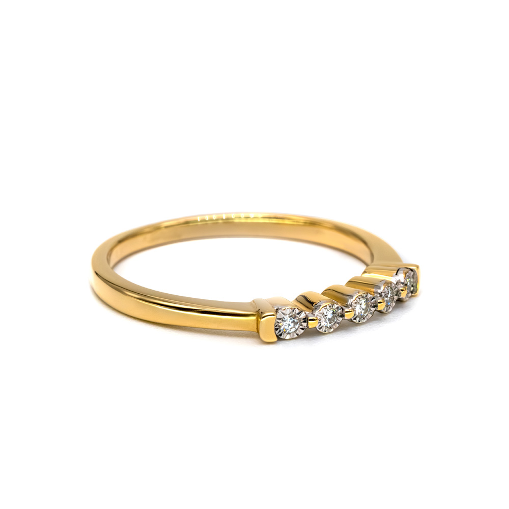 A Myosotis gyűrű finom arányú, lekerekített szárával és comfort-fit profillal kényelmes viseletet kínál, miközben az arany meleg tónusát erős tükörfényes polírozás hangsúlyozza. Öt egyforma, briliáns csiszolású gyémánt sorakozik karmos foglalatban, ezzel a klasszikus egyenes vonalú elrendezés optimális fénytörést, sugárzó ragyogást biztosít. A kövek magassága harmonikusan illeszkedik a gyűrű finom vonalvezetéséhez, alkalmas mindennapi vagy ünnepi eleganciához, akár önállóan, akár gyémánt pavé karikák mellé kombinálva.