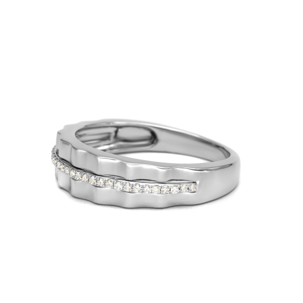 A Nemesia gyűrű szoborszerű, hullámos vonalvezetésű dizájnja a modern ékszertrendek egyik kiváló példája. A 14 karátos fehérarany sávja szabályosan váltakozó ívekkel, szinte organikusan omlik körbe az ujj körül, miközben egy teljes gyémántsor fut végig rajta. A pavé foglalat precíz, apró gyémántjai minden szögből erőteljes csillogást biztosítanak, a fény az ívek mentén dinamikusan mozdul.