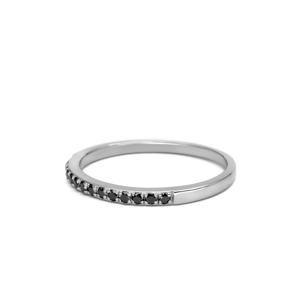 Az Onyxia gyűrű a modern elegancia kihívó kontrasztját hozza el: szűk, 14 karátos fehérarany sínjén apró, egyenletesen sorakozó fekete gyémántok futnak végig. Az ékszer felülete makulátlanul polírozott, a kőfoglalatok stabilan tartják a különlegesen csillogó ékköveket, kiemelve a mélyfekete árnyalatok karakteres ragyogását.