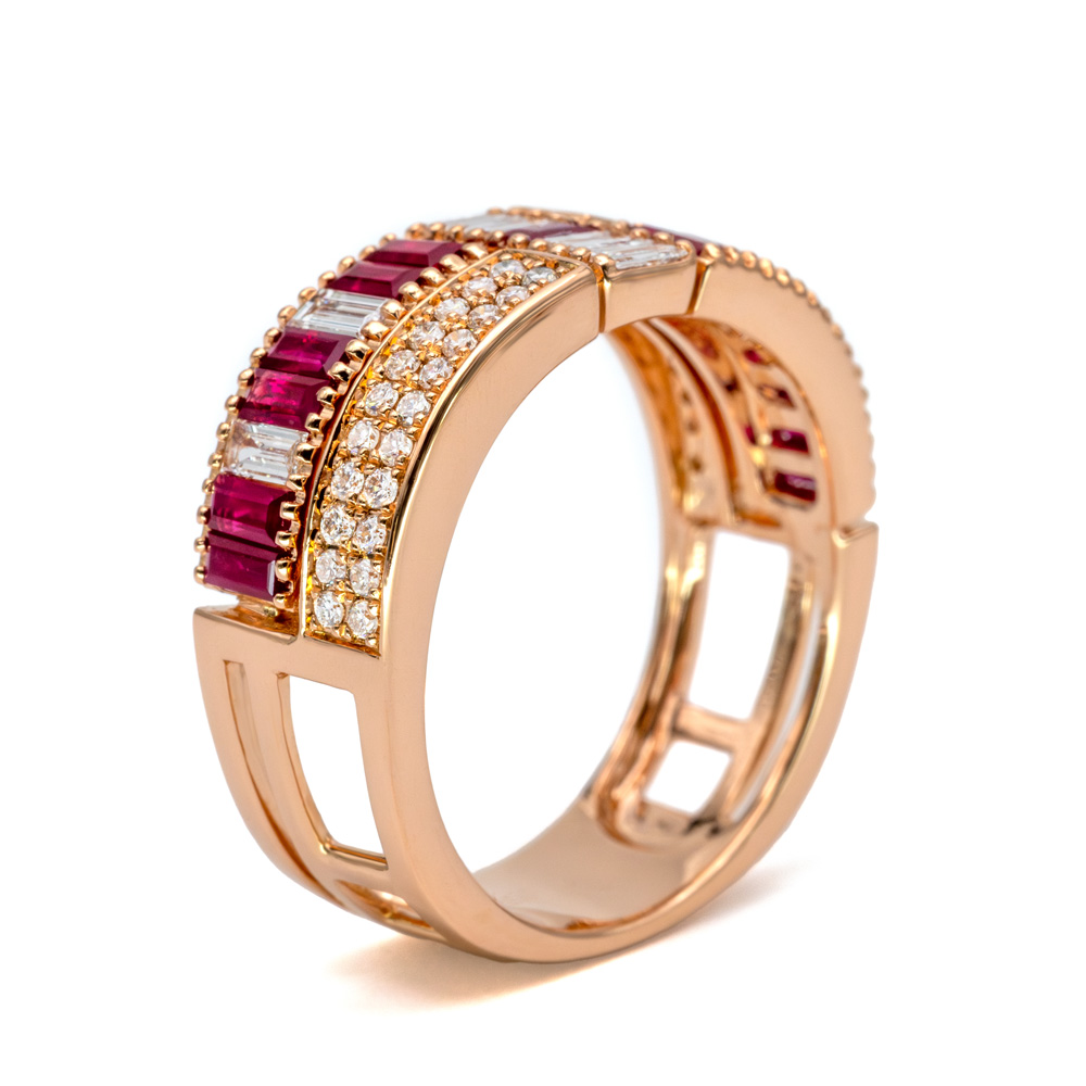 Az Orlissa gyűrű a modern luxus látványát rózsa arany alapon, gazdag geometrikus sávokban elhelyezett rubin baguette kövekkel és csillogó briliáns csiszolású gyémánt pavé sávokkal kelti életre. A széles, áttört szerkezet kényelmes viseletet ad, miközben minden mozdulatra élénk kontrasztot, fényjátékot és karaktert sugároz. A rubinsorok szenvedélyes színe, a gyémántok ragyogása, valamint a rózsa arany meleg tónusa együtt igazán egyedi, luxus érzetet teremt.