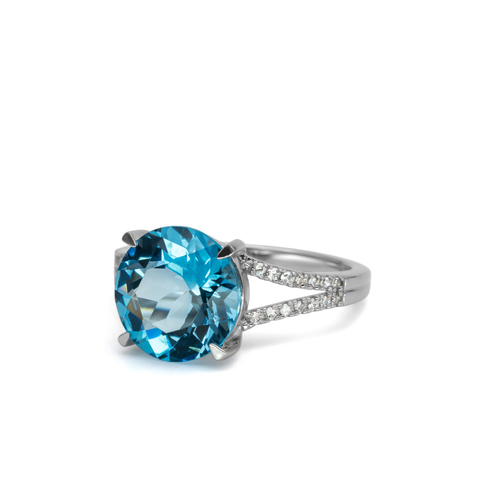 Ez a gyűrű finoman ívelt, tükörfényes fehérarany sínnel öleli körbe az ujjat, amelynek karcsú, mégis stabil aránya elegáns hátteret ad a középen trónoló nagy, kerek csiszolású kék topáznak, miközben a szárak felső részén gyémántsor fut végig, extra szikrázást adva a kompozíciónak.
