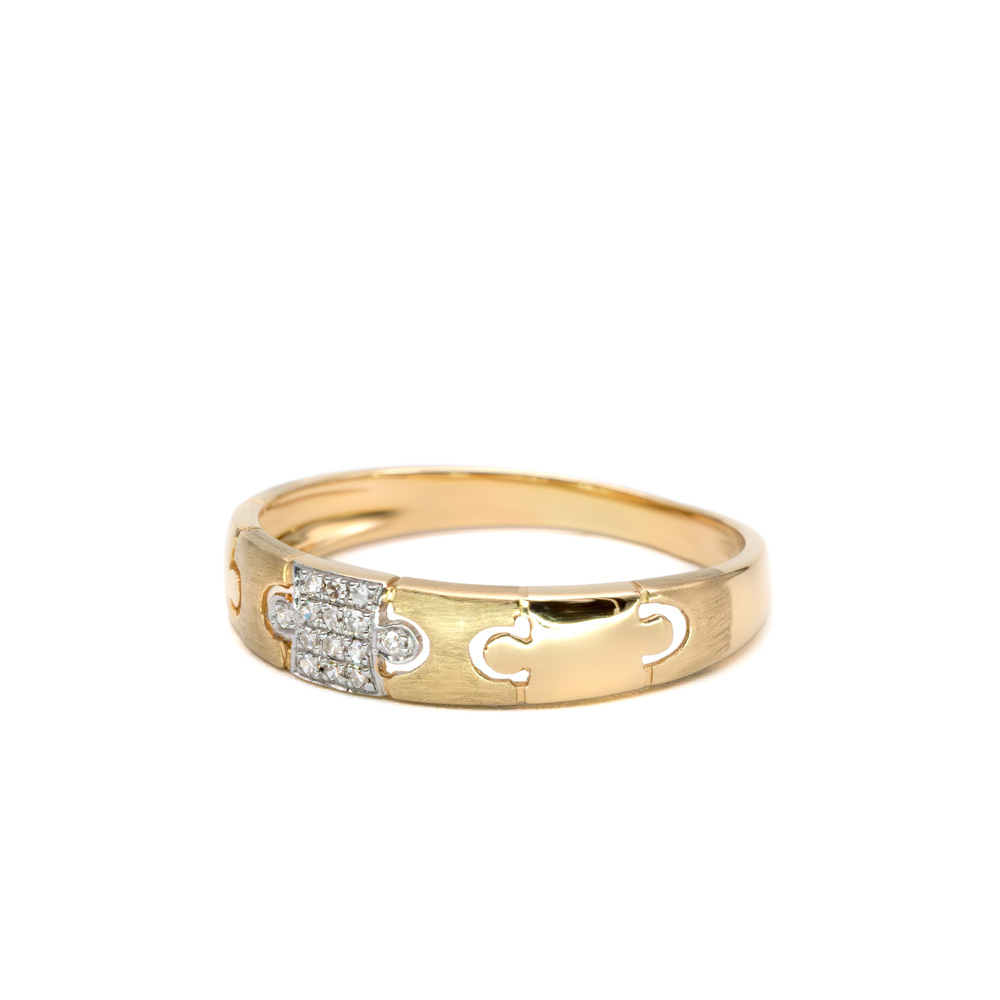 A Vionelle sárga arany gyűrű a visszafogott luxus megtestesítője: 14 karátos, enyhén mattított sínje közepén négyzet alakú pavé foglalatú briliáns gyémántmező ragyog, mellette modern áttört C-motívumok teszik különlegessé az összhatást. A precíz geometriát a finom ívek és a szatén fényű felület teszi harmonikussá, a kövek szikrázó ragyogását az arany bársonyos színe még elegánsabbá emeli.