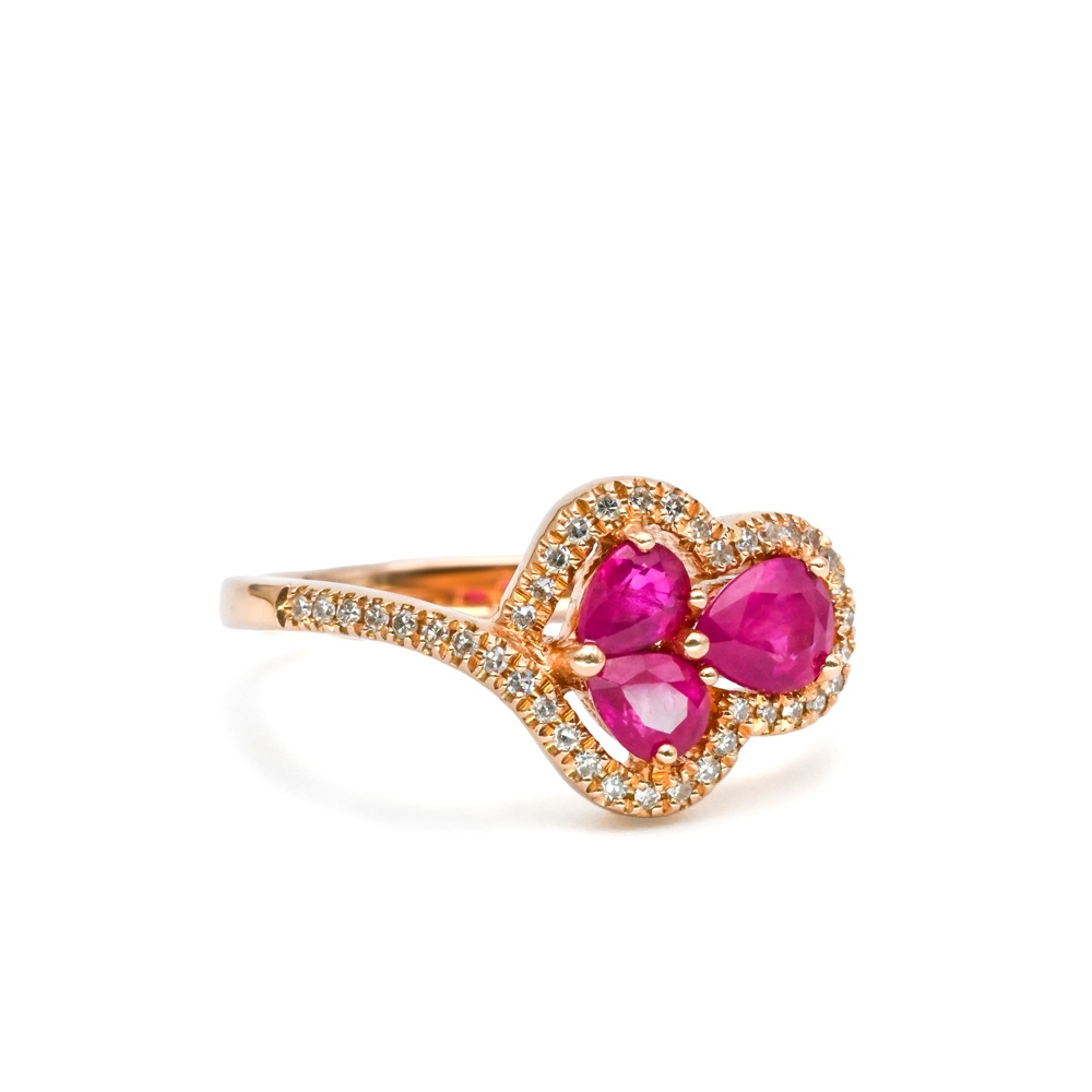 A Cloverina gyűrű megjelenésében a szerencse szimbólumaként ismert lóhere triflás motívuma tükröződik: középpontjában három csepp alakú, ragyogó rubin alkot modern virágszirmokat, melyeket körben teljes pavé briliáns gyémántkeret foglal keretbe. A rozé arany, kecses szár kerekded, mégis markáns díszítettséggel társul; a drágakövek mély színe és a gyémántok intenzív csillogása modern és vintage stílusú ékszerrajongóknak is tökéletes választás. A Petrals Cloverina igazi „statement piece” – nem csak alkalmi, de mindennapi szerencsehozó, amely a clover (lóhere) motívum révén a természet örök szépségét idézi.