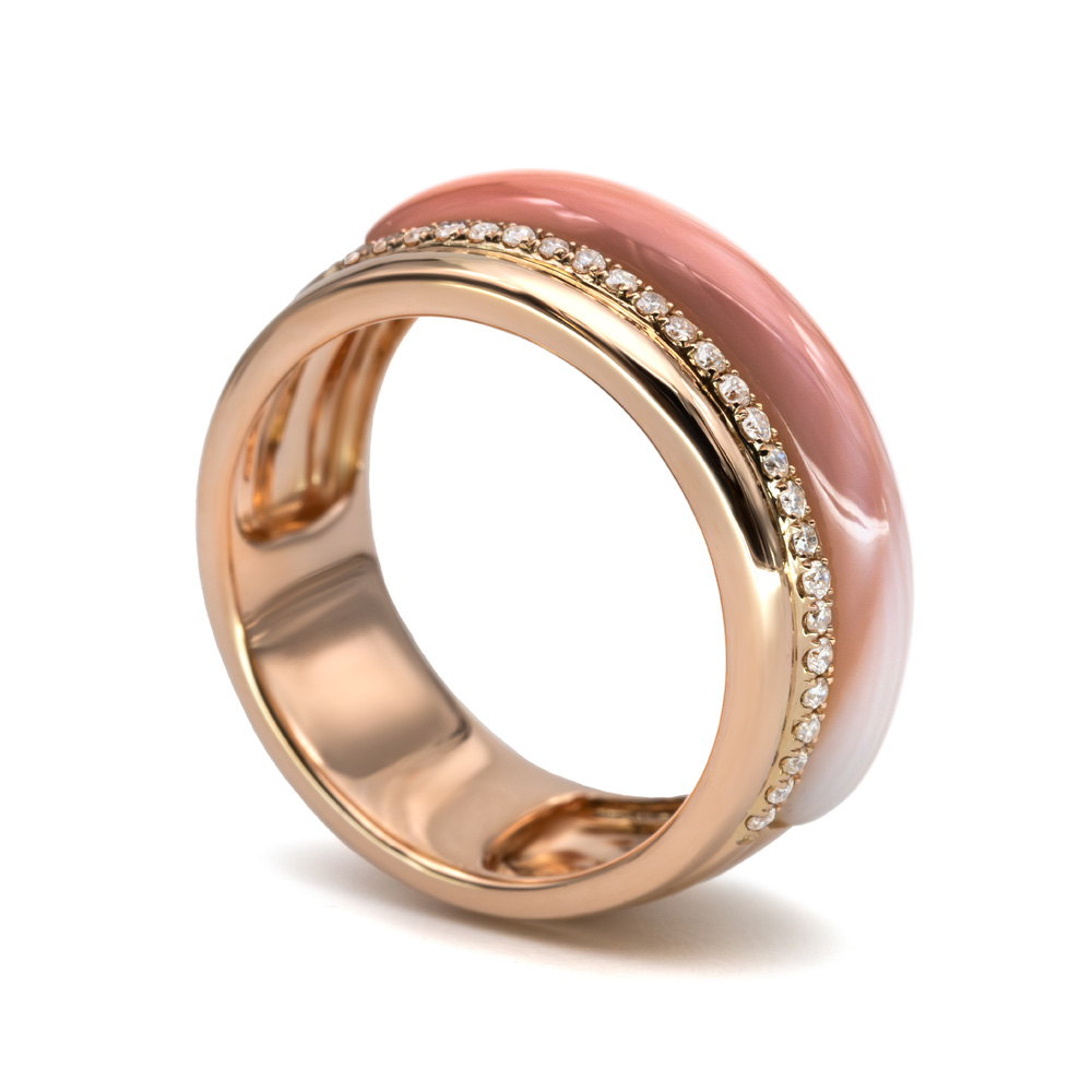 A Rivolia gyűrű karakteres, széles rozéarany sínje körül tekeredő opálos, rózsaszín agát betéttel igazi statement darab. A peremet kecses pavé gyémántsáv díszíti, extravagáns fényt adva minden mozdulatra. Különlegessége, hogy a gyémántok mellett rózsaszín Sc típusú mellékkövek csillannak – ezek finom árnyalatukkal új szintre emelik a dizájn egyediségét. A rózsás agát sima textúrája harmonizál a meleg rozéaranygal, a gyűrű egészének fényjátéka ragyogó és puha egyszerre.