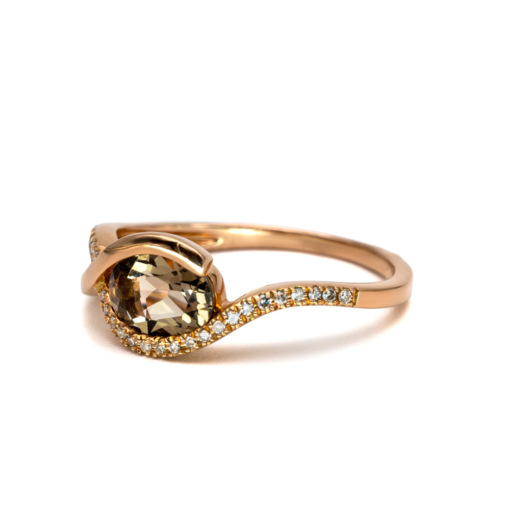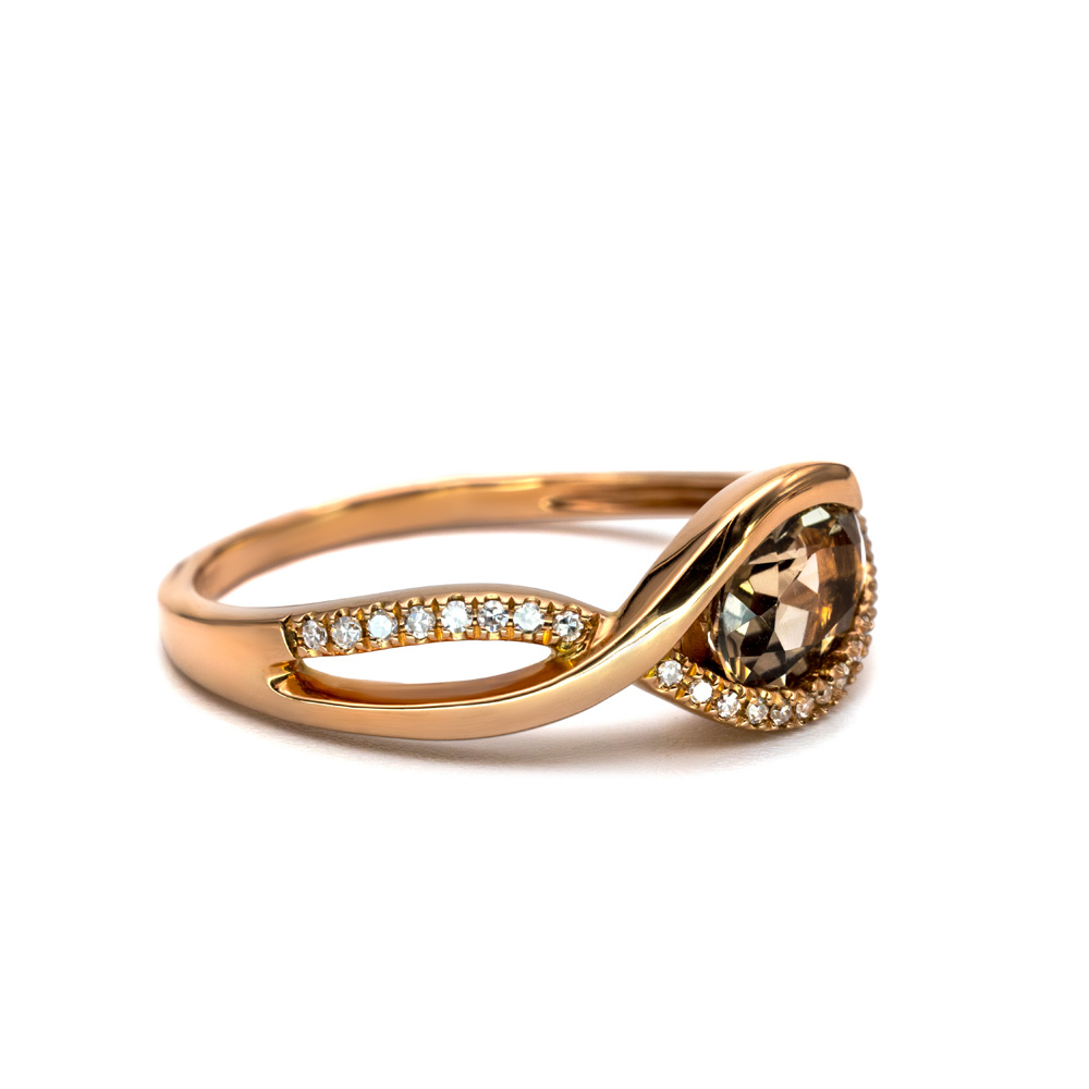 A Salvia gyűrűt karakteres, minimál-modern szemmotívum ihlette: a rózsaarany szár korszerű hajlata közrefogja a középen elhelyezkedő ovális füstkvarcot, amelyet egyik oldalon végig apró pavé gyémántsor tesz ragyogóvá. Az áttört kialakítás miatt a kő szinte lebeg, a rajzolat egyszerre modern és vintage, nőies és titokzatos. A Petrals Salvia izgalmas, természet ihlette modell, tökéletes mindennapi és különleges alkalmakra, különösen azoknak, akik szeretik az izgalmas formákat, a rózsaarany és a füstölős árnyalatok különleges találkozását.