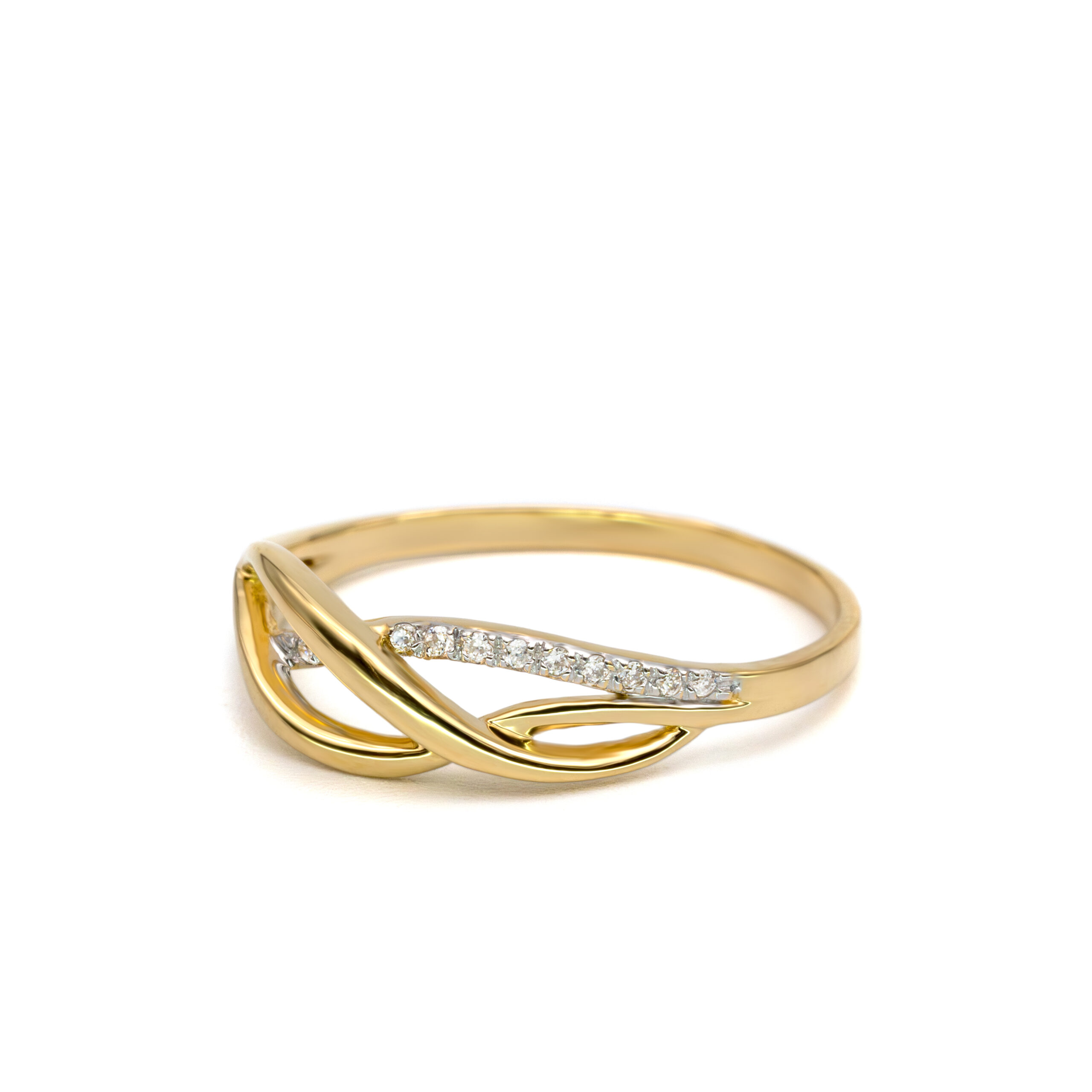 Az Alorina gyűrű különleges, két szálból lágyan összeölelő sárgaarany sávokból épül fel, egyikük egészét apró, briliáns gyémántsor díszíti, míg a másik tisztán, fényesen tükröződik vissza minden mozdulatra. A dinamikus átkulcsolt forma nőies ritmust ad, az arányok egyensúlyban tartják a modern eleganciát és a kényelmet.