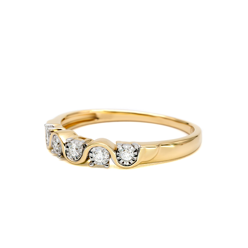 A Senecia gyűrű karakteres hullámmintás ívein öt darab, ragyogó briliáns csiszolású gyémánt fut végig sárgaarany sínbe simulva. A hullámzó arany elemek és a hófehér foglalatok plasztikus ritmusában minden kő a fény újabb szikráját adja. Az összhatás egyszerre modern, trendi és klasszikus.