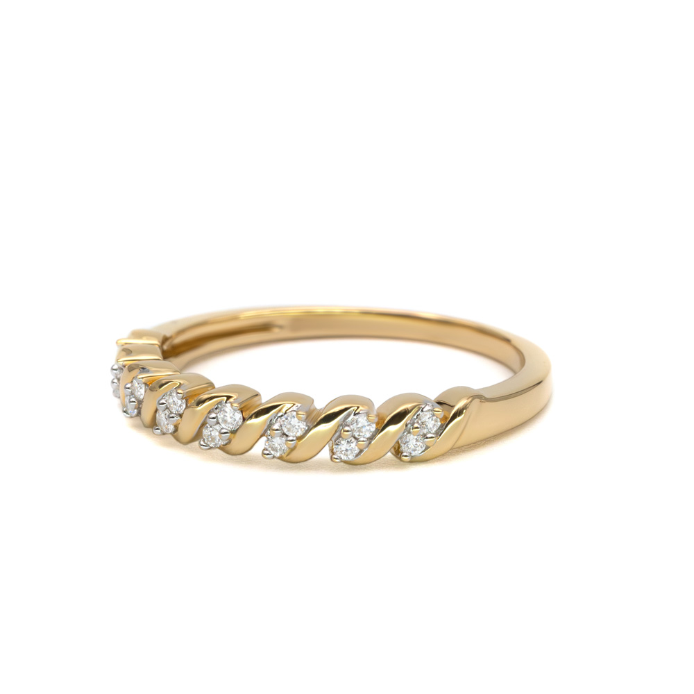 Az Amatina gyűrű egyedülálló módon ötvözi a klasszikus sárgaarany fényét a dinamikus, csavart mintázat precizitásával. A sín felszínét domború, átfedő aranypántok alkotják, köztük szikrázó, briliáns csiszolású gyémántok ülnek: minden beillesztett kő tökéletesen közrefogott, hogy a legmagasabb ragyogást adja.