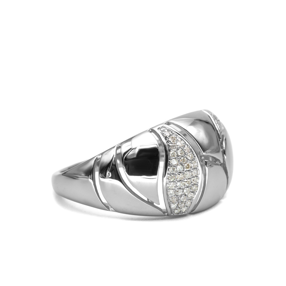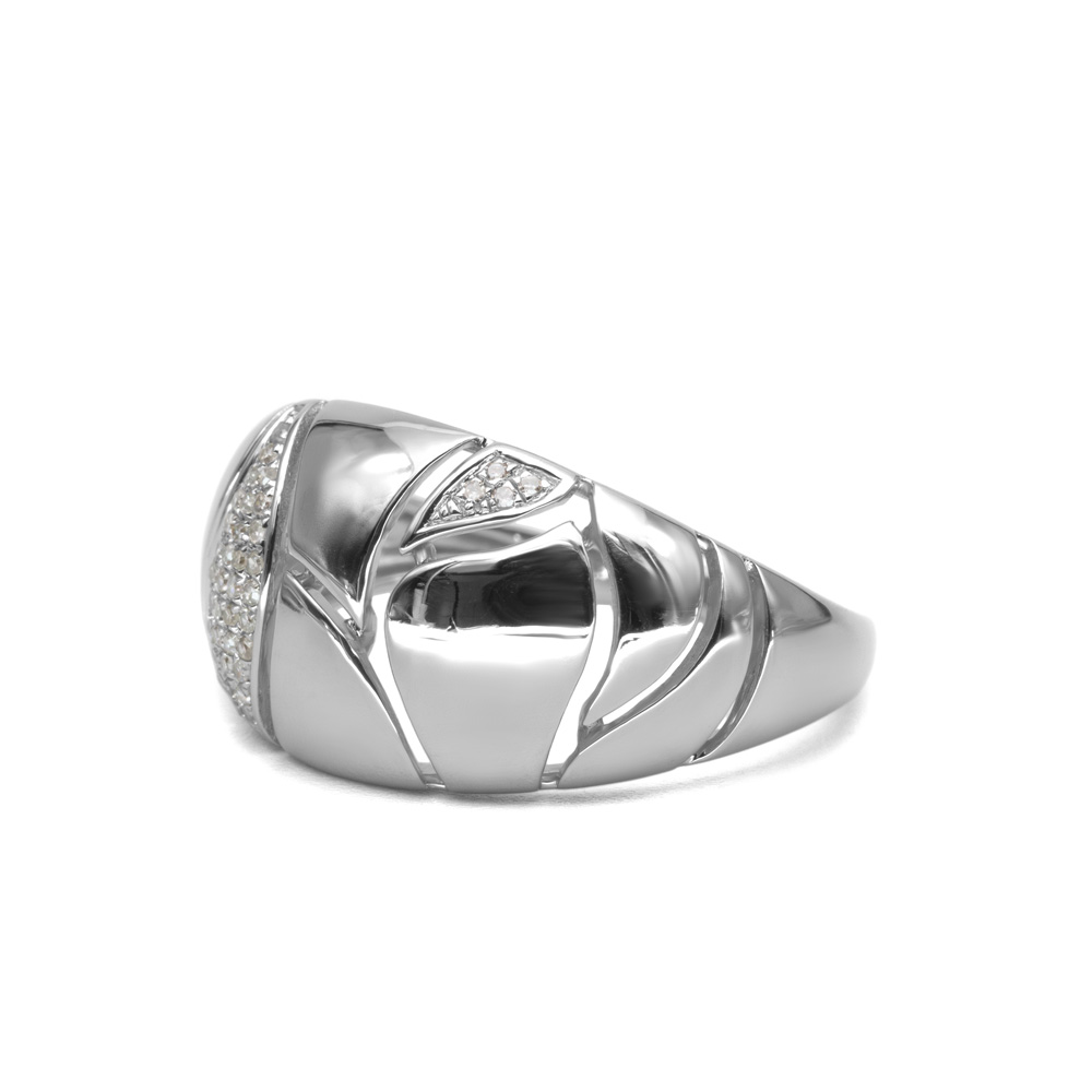 A Silphium gyűrű különleges plaszticitása és izgalmas mintavilága egyesíti a letisztult luxust és a természetes ihletést. Az ékszer masszív, domború 14 karátos fehérarany testét aszimmetrikus, stilizált levelek díszítik, melyeket ragyogó pavé gyémántmezők tesznek még hangsúlyosabbá. A motívumok plasztikus arabeszk mintázata lágyan követi az ujj ívét, a polírozott és köves felületek játéka minden mozdulatra dinamikusan visszaveri a fényt, miközben a síkok közti átmenetek végigsimítják a tekintetet.