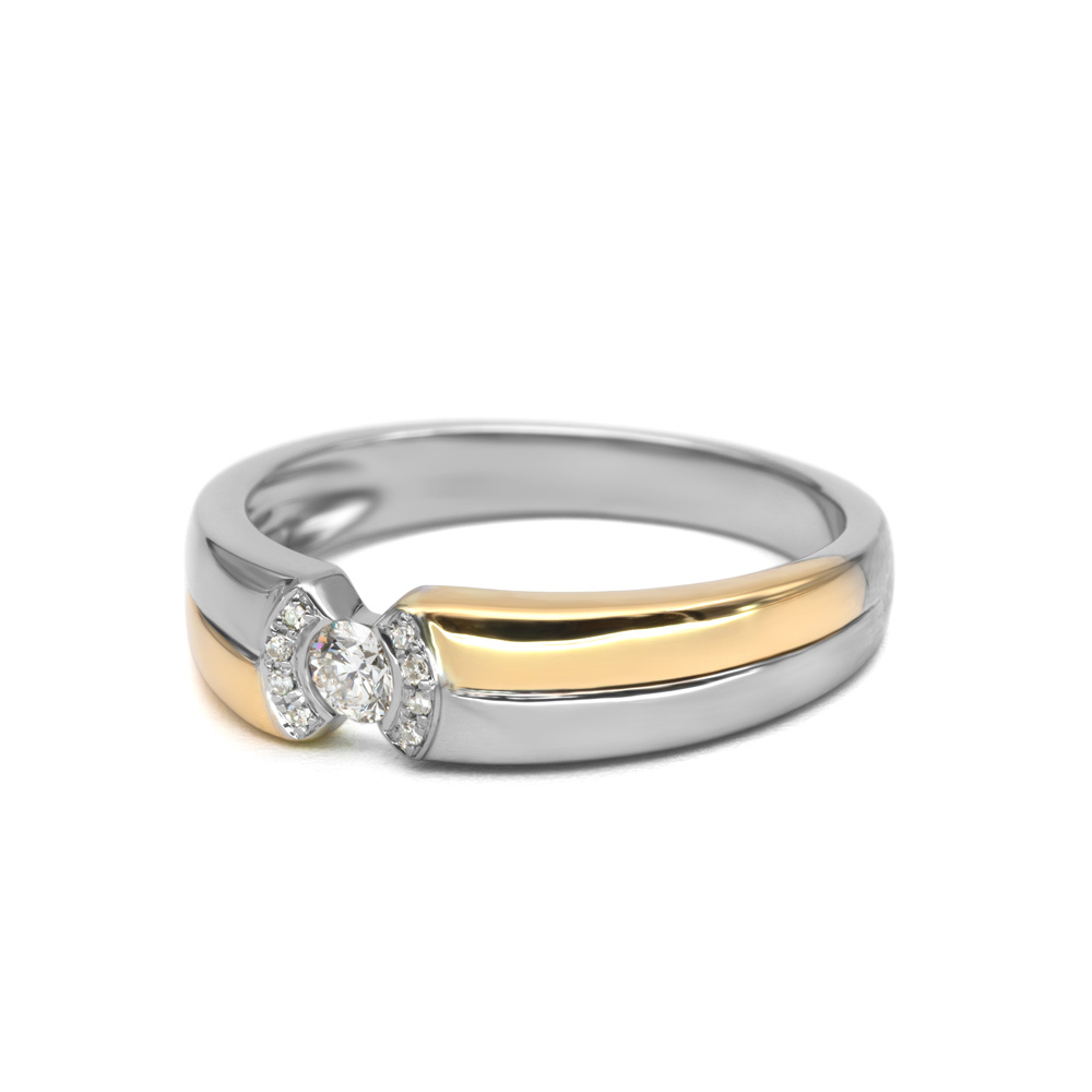 Az Orelina gyűrű különleges többszínű aranyból készül: fényes fehér- és sárgaarany sínei kecsesen futnak végig az ujjon, a középponton csillogó, briliáns gyémánt emeli ki a kompozíciót. A foglalat modern, mégis időtlen vonalvezetésű, mindkét oldalon kísérő gyémántokkal díszítve, így a felület ragyogása minden mozdulatra éled.