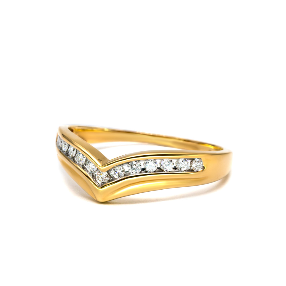 A Verbena gyűrű lenyűgöző geometrikus eleganciát kínál: a karika finoman V-alakban ível, amit egy sor briliáns csiszolású gyémánt kísér végig, precíz csatornafoglalásban rögzítve. A ragyogó kövek forró, klasszikus sárga arany környezetben tündökölnek, és vizuálisan nyújtják az ujjat. A sima, tükörfényű aranyszár diszkrét, dekorációmentes, minden részletében modern és időtlen.