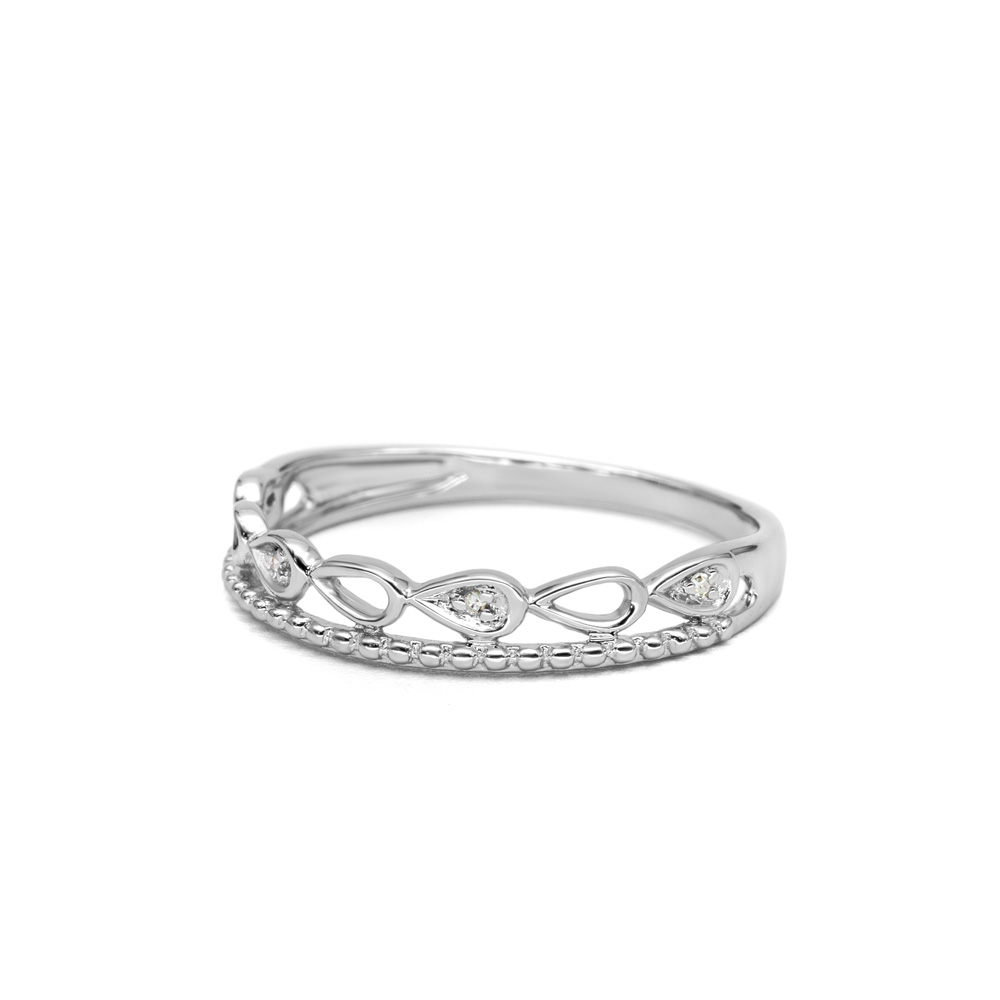 A Veronica gyűrű játékos eleganciát sugall, finoman átgondolt részletekkel. Két egymás mellett futó sín alkotja – az egyik kifinomult, apró gömbökkel díszített, míg a másik légies, átszőtt levélmintákból épül fel. Az áttört, stilizált levelek minden pillantásnál más fényeket engednek át, töltésükben ragyogó gyémántok ülnek, így a motívum egyszerre légies, mégis karakteres.