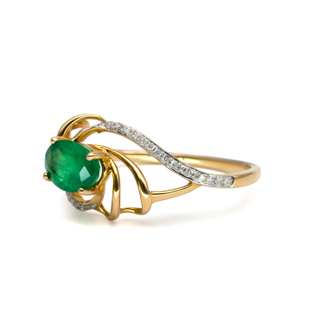 A Zinnia gyűrű igazi szecessziós inspirációval tűnik ki a Petrals kollekcióból: közepén egy ovális csiszolású, élénk zöld smaragd ragyog, amelyet sárga arany indaszerű vonalai ölelnek körbe. A könnyed arany szár metszetét végig apró pavé gyémántok hangsúlyozzák, melyek a mozgás és a természet ihlette légies sziluettet még fénylőbbé és vibrálóbbá varázsolják.